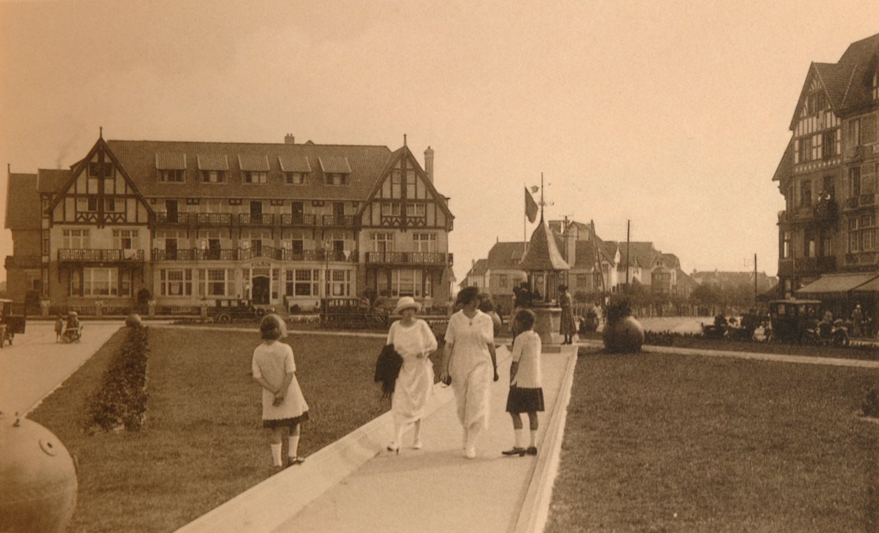 travel · exterior · outdoors · europe · holiday · holidays · vacation · coast · female · women · woman · people · girl · girls · walking · town · coastal · country · path · resort · seaside · continent · flanders · belgium · european · tourist · town square · belgian · location · century · vintage · destination · popular · lady · concept · holidaymaker · monochrome · rambling · holidaymakers · black white · black and white · 1900s · 20th century · tourism · coastal resort · popularity · west-vlaanderen · outside · building exterior · photograph · postcard · unknown · knocke-sur-mer · knokke-heist · le zoute · ern thill · thill · ern · place albert · The Print Collector/Heritage Images |