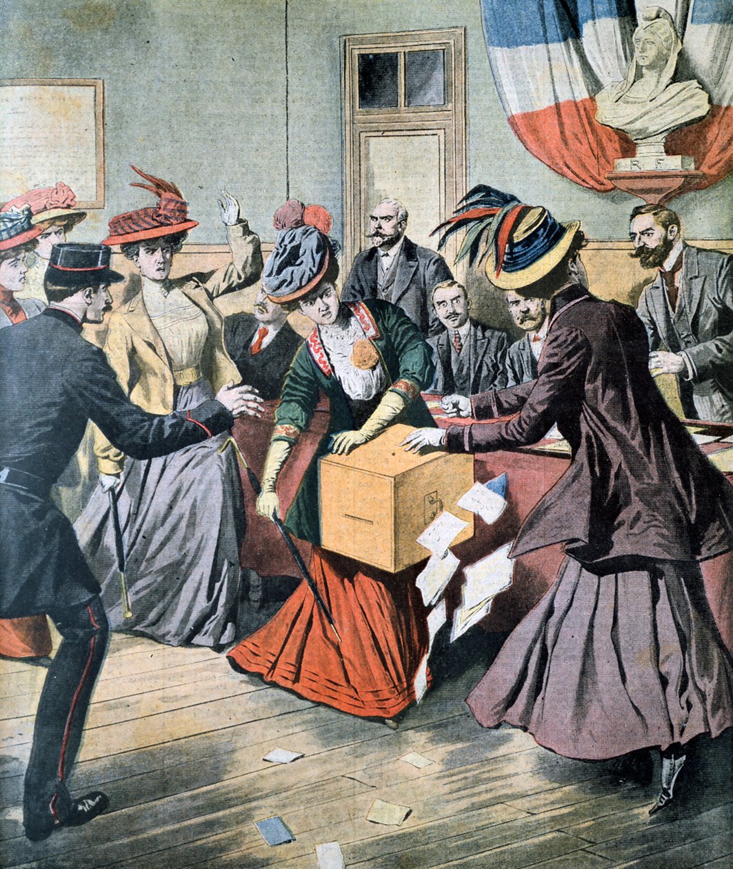 vertical · female · women · woman · people · male · interior · indoors · fashion · politics · country · occupation · violence · clothes · belgium · angry · color · colour · anger · dress · belgian · policeman · location · disruption · century · profession · inside · feminism · democracy · lady · concept · violent · rage · protest · fury · metaphor · ballot box · voting · protesting · protester · consternation · election · rights · 1900s · 20th century · disruptive · overturned · womens rights · ann ronan pictures · ballot paper · democracy at work · suffrage · suffragette · tgn · womens liberation · anon · anonymous · Ann Ronan Picture Library/Heritage-Images