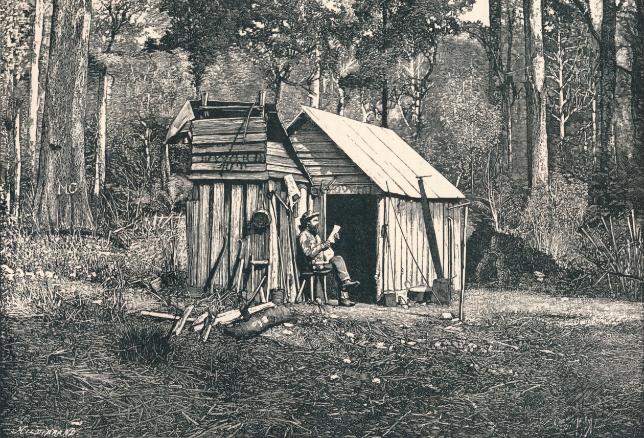 outdoors · woodland · building · buildings · people · male · sitting · australia · australian · country · reading · location · century · alone · concept · one person · monochrome · 19th century · encampment · black white · black and white · bw · nineteenth century · engraving · squatter camp · unknown · The Print Collector/Heritage Images |