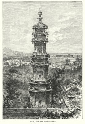 exterior · city · building · buildings · architecture · country · tower · china · beijing · peking · palace · location · century · summer palace · outside · monochrome · 19th century · black white · black and white · nineteenth century · engraving · landscape · unknown · The Print Collector/Heritage Images