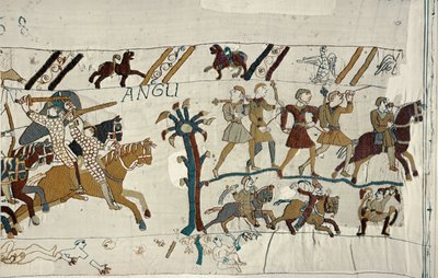 animal · armour · battle · horse · chainmail · tapestry · textile · hastings · west sussex · united kingdom · europe · flight · normans · history · Musée de la Tapisserie, Bayeux, France / Bridgeman Images