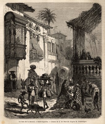 La casa de la Merced (now Mercy Street) in Saint Augustine, the oldest city in the United States, founded by the Spaniards in 1565; main street of the city, small and populous, with various animals and a singular blend of various American t(La casa de la Merced (now Mercy Street) in Saint Augustine, the oldest city in the United States (United States), founded by the Spaniards in 1565; main street of the city, small and populous, with various animals and a singular blend of various American t)Unknown artist |