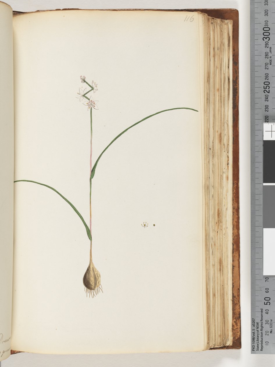 drawing · painting · australian · botany · botanical · new south wales · flora · plant · natural history · colonial · bulb · root · flower · white · zig zag · zig-zag · stalk · natural size · full-sized · full-size · Mitchell Library, State Library of New South Wales / Bridgeman Images