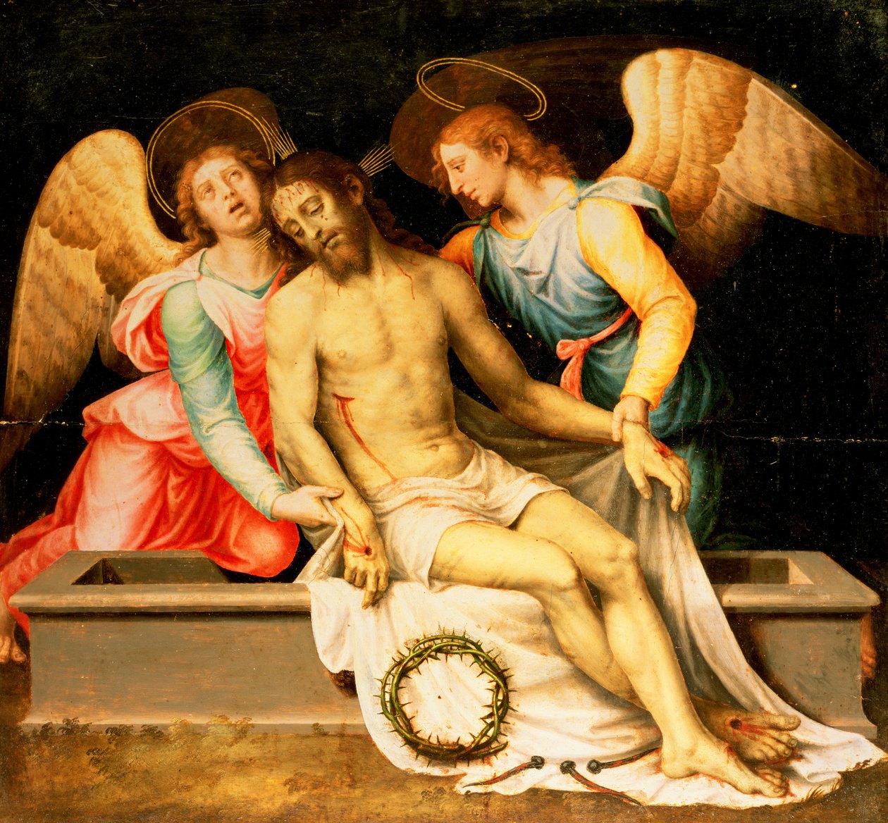 tomb · stigmata · crown of thorns · angel · mourning · crying · weeping · death · shroud · nails · Caylus Anticuario, Madrid, Spain / Bridgeman Images |