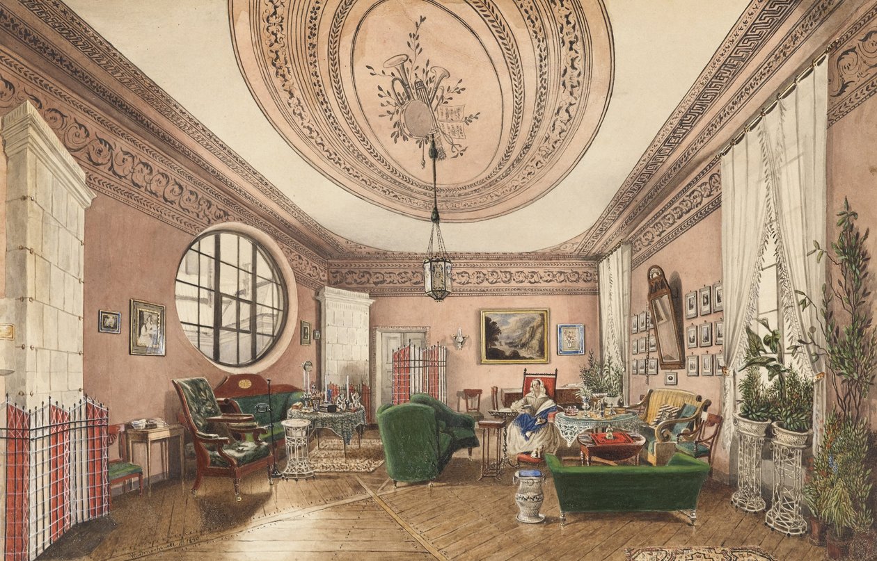 room · chair · perspective · green · windows · chandelier · paintings · plants · couch |