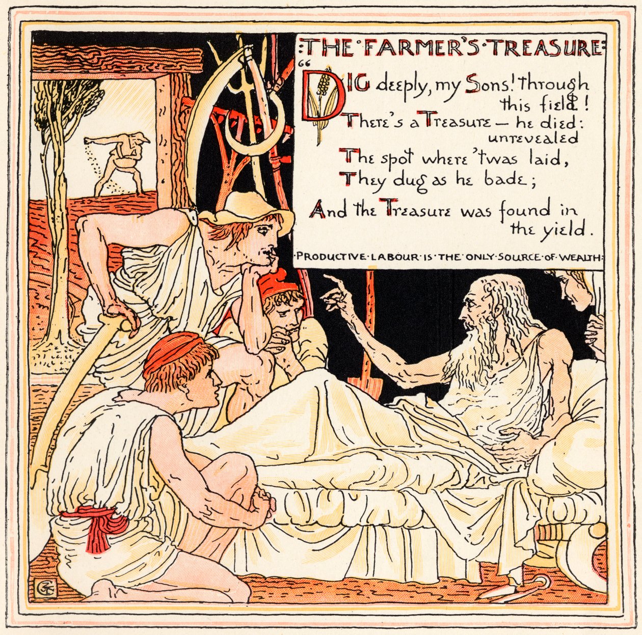 The Farmer's Treasure, Illustration from 'Baby's Own Aesop', Engraved and Printed by Edmund Evans(The Farmer's Treasure, illustration from 'Baby's Own Aesop', engraved and printed by Edmund Evans, London, published c.1920 )Walter Crane |