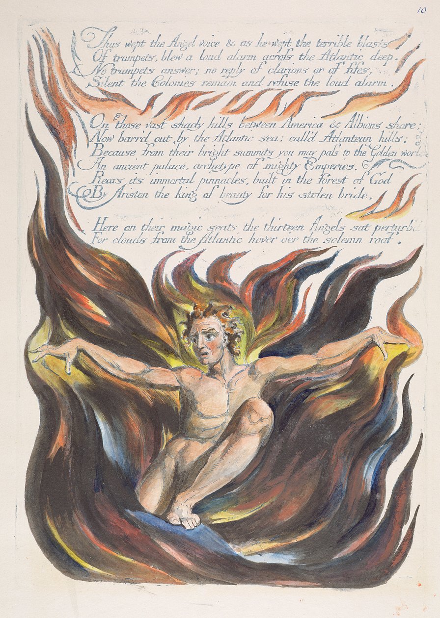 illustration · romantic · romanticist · poem · poetry · american revolution · male · nude · fire · fiery · visionary · allegory · american revolutionary war · engulfed in flames · lost soul · vision · portent · Yale Center for British Art, Paul Mellon Collection, USA / Bridgeman Images