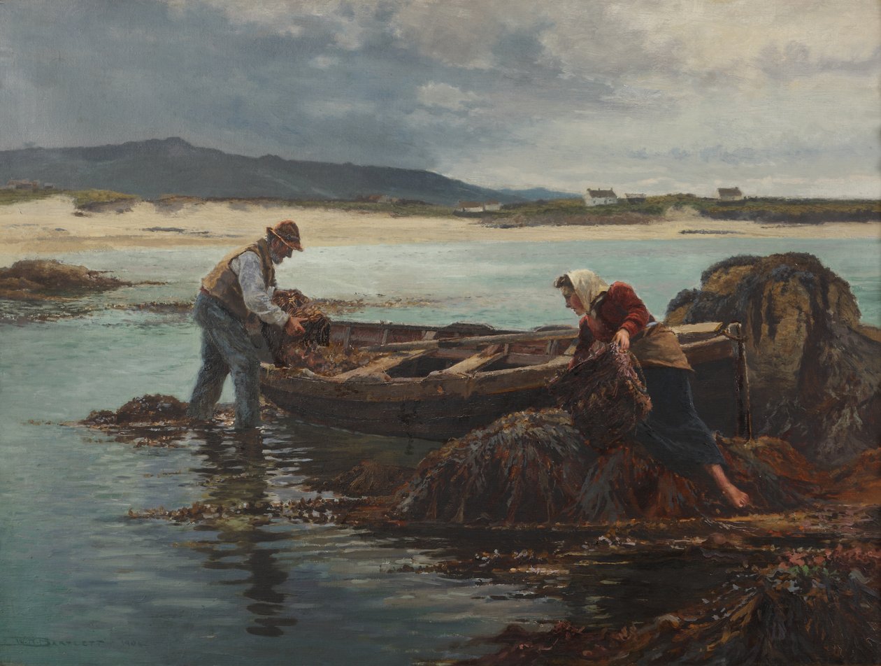 boat · landscape · male · female · fishing · seaweed · collecting · harvesting · rowing · weeds · lettuce · gathering · poor · rural · beach · clouds · woman · scarf · Worcester City Art Gallery & Museum, Worcestershire, UK / Bridgeman Images |