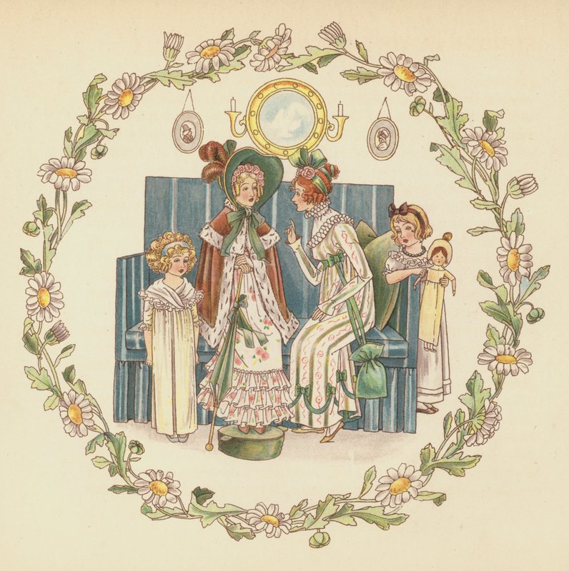 mrs leicesters school · schools · education · teaching · learning · girl · girls · nostalgia · nostalgic · cute · children · child · sentimental · decorative · charming · floral · sofa · conversation · gossip · doll · bored · boredom · Private Collection / Bridgeman Images · / Look and Learn