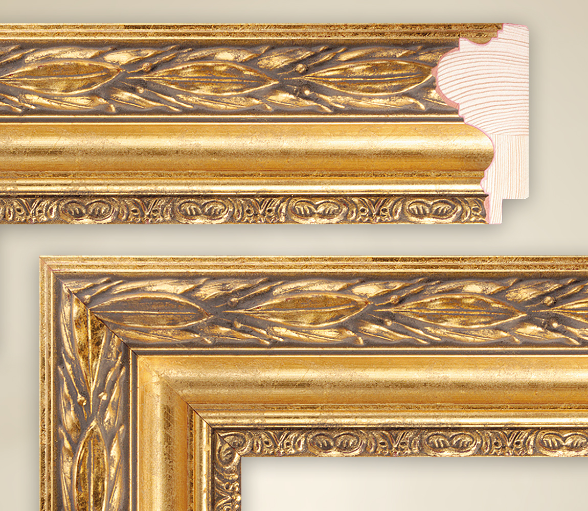 | The dream of a gold frame is the Ruth model, which the Victoria picture frame series presents under its ornate decorative frames. Light, shiny gold and dark brown, matt elements as an ornamental background and delimiting lines form the color aspect of this frame. Four different strips form the overall picture of Ruth in the front view, whereby the highest part of the real wood strip is 36 mm and the overall strip sequence is a proud 65 mm wide. It starts very narrow on the outer frame, where a delicate double bar in shiny gold is a placeholder for the edge. After this simplicity, the designers immediately followed an eye-catching ornament bar. Leaf-like elements adorn the bar on dark brown primer. Horizontally, narrowly shaped, they follow the frame with the leaf tip to the right. The gold of Ruth shows itself in its most beautiful shine on the inwardly curved central bar. As a special design element, so-called craquelé was inserted here in a very delicate manner, a network of cracks known from oil paintings. A double narrow bar in gold finally clears the way for the final ornament bar. This shows an alternation of round and floral elements that appear like a small relief in the overall view. |